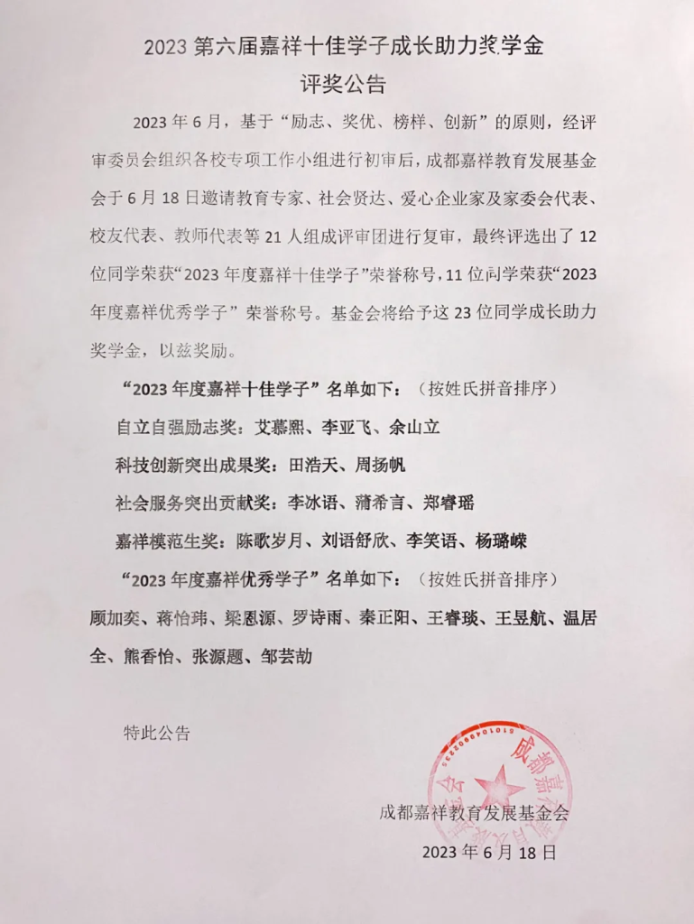 2023年6月18日,由成都嘉祥教育发展基金会主办的“2023年嘉祥十佳学子成长助力奖学金”复审评选顺利开展。经评审团现场评审,最终评选出12名同学荣获“2023年度嘉祥十佳学子”荣誉称号,11名同学荣获“2023年度嘉祥优秀学子”荣誉称号。评奖结果公示如下: