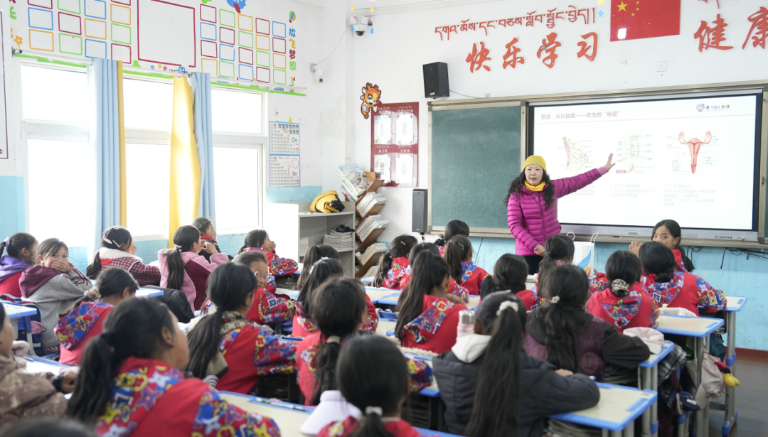 当清晨的第一缕阳光洒在经幡上,在雪山环绕的校园教室里早已座无虚席。来自高原县城、牧区的4-6年级女孩们,大多是第一次系统地了解青春期知识。由于地域限制和传统观念影响,女孩们对青春期身体发育充满疑惑更羞于启齿。”嘉YOU女孩” 项目的志愿者老师们,用温柔的话语搭配直观有趣的课件,带领她们逐一解开了有关女性的“青春密码”:”乳房发育是正常的生理现象,不必自卑与害羞”,” 月经是女孩成长的标志,正确使用卫生巾能让我们更舒适自信 “,“面对成长我们应该如何做好自我保护”……