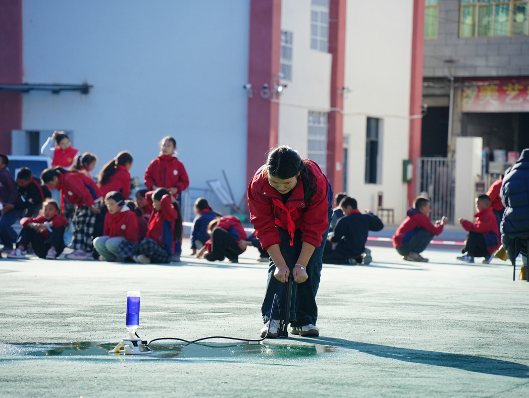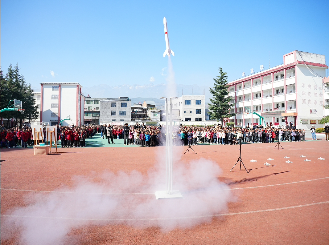 27日上午,全校师生在操场集合。新民镇中学小学校校长曲木石子首先致欢迎词;成都嘉祥教育发展基金会秘书长罗帅介绍项目初心;共青团越西县委书记勒尔阿尕鼓励同学们大胆探索、树立科技报国理想。三位嘉宾的讲话简短朴实,为本次活动定下”体验为主、互动优先、积极探索”的基调。紧接着,创意科学秀、无人机方阵表演、动力火箭发射为本次活动拉开精彩序幕。