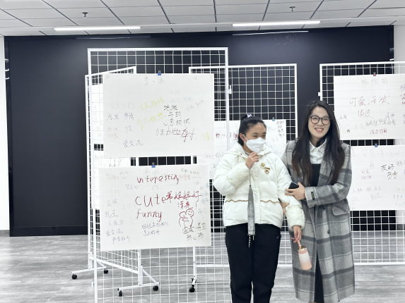 左图为小朋友在志愿者的陪伴下,在“品质墙”的上书写下属于自己的独特印记