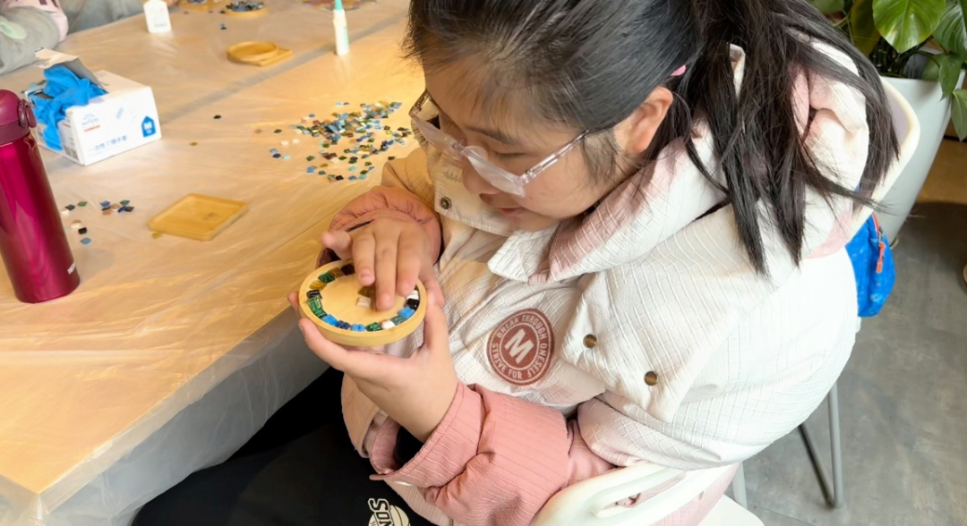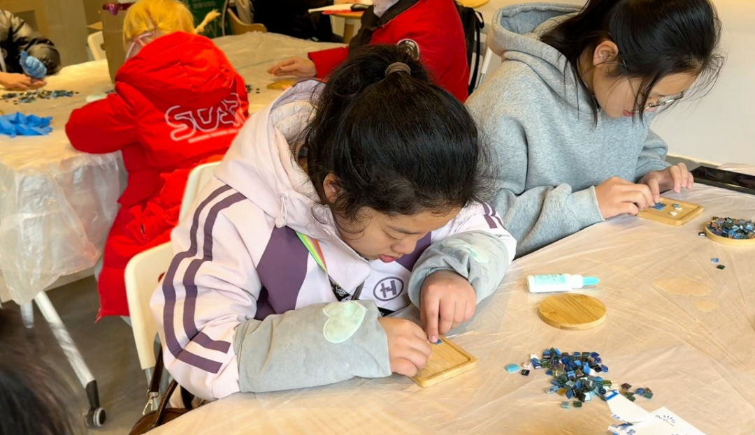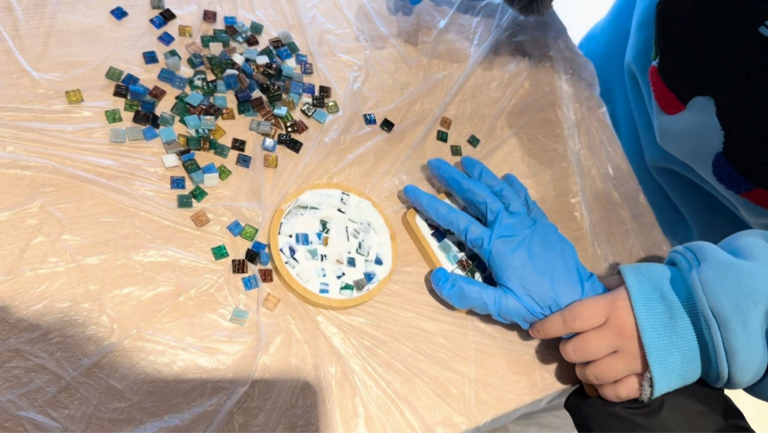 在志愿者的耐心引导下,小朋友们通过马赛克碎片,将其逐一拼贴在杯垫底板上。拼接过程中,大家不断尝试、调整位置,在触觉感知中完成独一无二的图案设计。