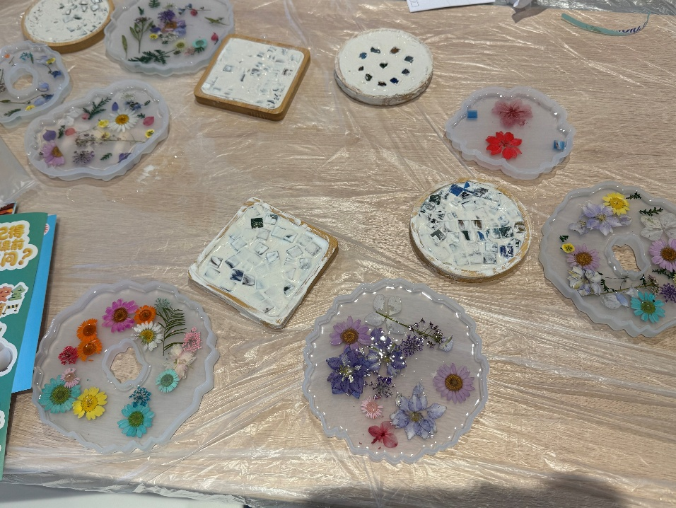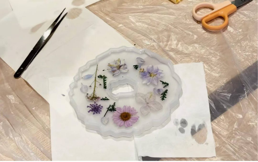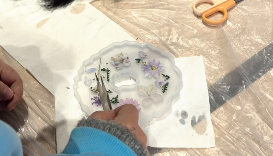 这一环节将自然元素融入手工创作。小朋友们在杯垫中间放置干花装饰,再由志愿者协助完成滴胶固定。透明树脂包裹花材,不仅增强了作品的层次感,也让孩子们在触摸中感受到“被封存的美”。